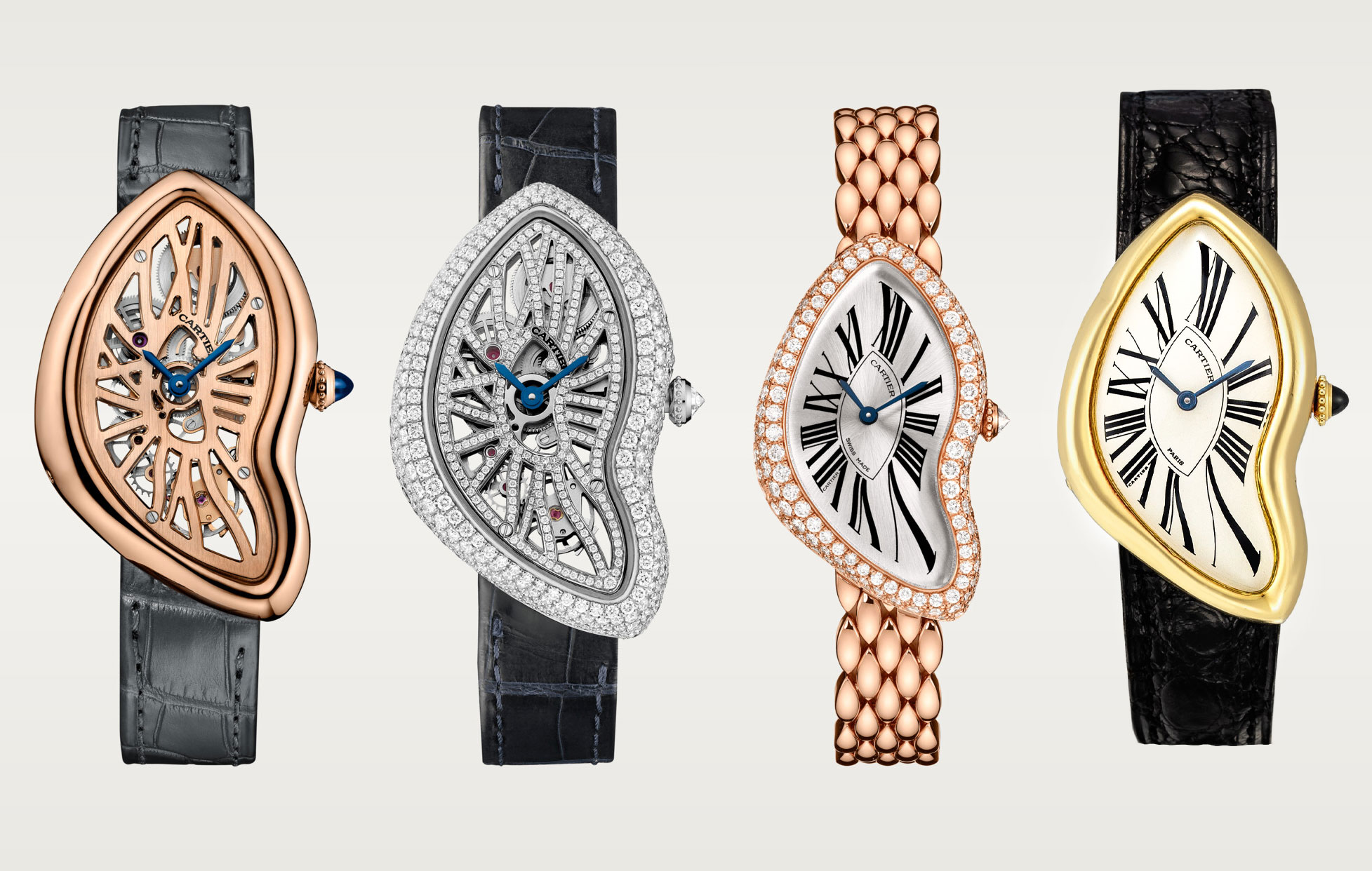 Một số các biến tấu của dòng Cartier Crash, với khung xương (skeleton), vỏ làm từ nhiều chất liệu và nạm kim cương. Ảnh: Cartier